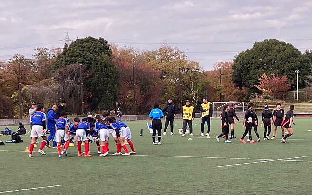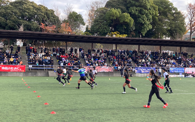 初冬の天気に恵まれた大会当日、神奈川県下23チーム182名の精鋭が集った本大会は保護者やスタッフ等を含めると、観戦スタンドに入りきれないくらいの人数となり、寒さも吹き飛ばすくらいの熱気あふれる大会となりました。子どもたちだけでなく大人も本大会成功の為に心を一つに力を注ぎました。タグラグビーはラグビーの仲間です。まさに、品位・情熱・結束・規律・尊重の5つのコアバリューを兼ね備えた大会となりました。
