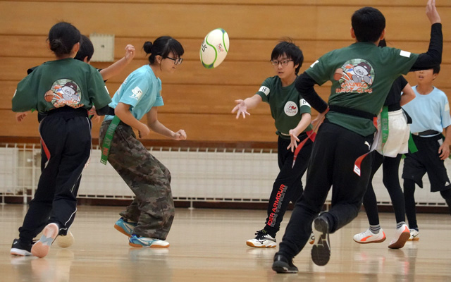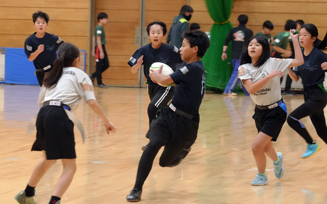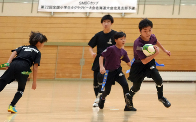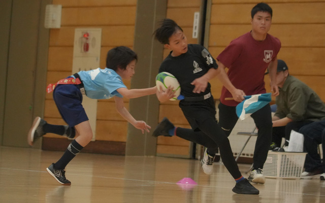 令和7年12月7日(日)、北海道立北見体育センター(北見市)で「SMBCカップ 第22回全国小学生タグラグビー大会」北海道大会北見支部大会が開催されました。オホーツク管内各地域から16チームが参加(うち4チームがやむを得ない事情で人数不足となりオープン参加)し、135名の選手のほか保護者、役員、管内のラグビーファンを含め、約280名の参加者が見守る中、各チームとも日ごろの練習の成果を発揮して熱戦を繰り広げました。また、支部独自の取り組みとして、高校ラグビーを例に、試合運営を通して地域スポーツが様々な担い手の力で支えられていることを学ぼうと、北見北斗高校と北見工業高校のラグビー部員をスタッフとして招き、社会人と共に大会の運営に協力していただきました。