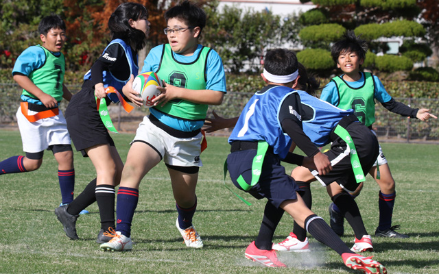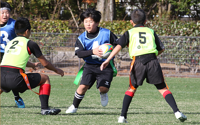なお、同時開催とした山口県タグラグビー体験交流大会では、小学1~3年生がフレンドリーマッチを行い、初心者も含めタグラグビーを楽しみました。また、子ども同士のリーグ戦の後には、保護者やコーチのチーム対子どもたちのチームで親子対決を4試合行いました。ゲームに参加した子どもも大人もレフリーもみんな笑顔でプレーし、会場全体が温かい雰囲気で盛り上がり、ラグビー普及活動の一助になりました。