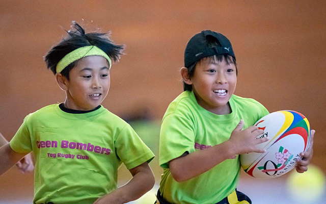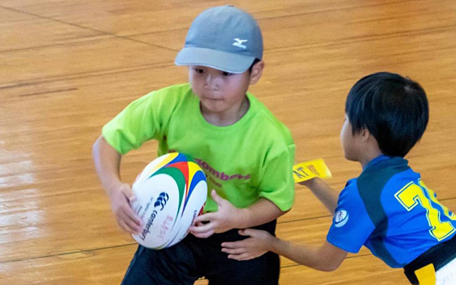 タグラグビー交流会では、小さな子どもたちがラグビーボールをかかえて縦横無尽に走り回る姿や、練習してきたパスワークを発揮してスピーディーにトライにつなげる姿もあり、プレーのひとつひとつに館内のスタンドからは「ナイスプレー」「ナイスタグ」と大きな声援も響いていました。初めてタグラグビーの試合に挑んだちびっこラガーもいましたが、走りきった後はいい表情でした。